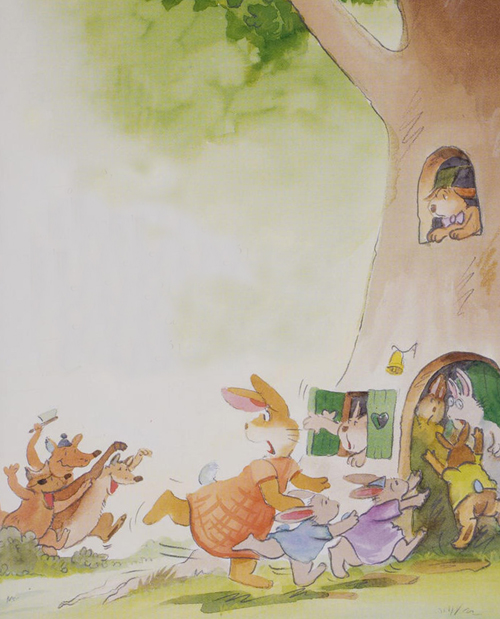 Abajo, conejos, conejas y conejitos lloraban y temblaban, cerraron las ventanas v echaron cerrojos a las puertas.